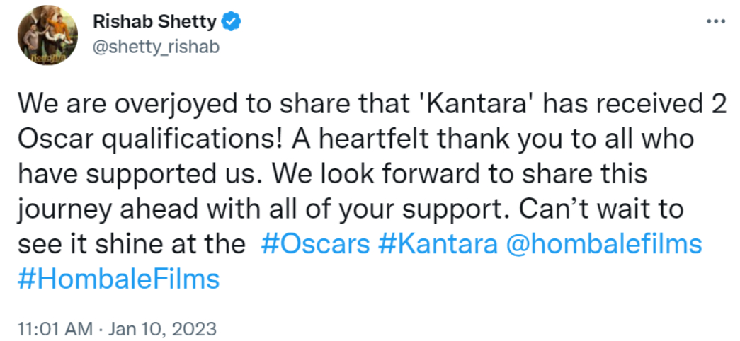 कांतारा के निर्देशक और मुख्य कलाकार ऋषभ शेट्टी ने फिल्म के ऑस्कर की कंटेंशन लिस्ट में आने पर खुशी जाहिर की। उन्होंने ट्वीट करके लिखा- हमें बेहद खुशी है कि कांतारा को द ऑस्कर क्वालिफिकेशंस मिले हैं। उन सभी का दिल से शुक्रिया, जिन्होंने हमें सपोर्ट किया। आपके साथ से हम इस यात्रा को आगे ले जाने की उम्मीद कर रहे हैं। अब ऑस्कर में इसके चमकने का इंतजार है। कांतारा को लेट एंट्री के तौर पर शामिल किया गया है।
