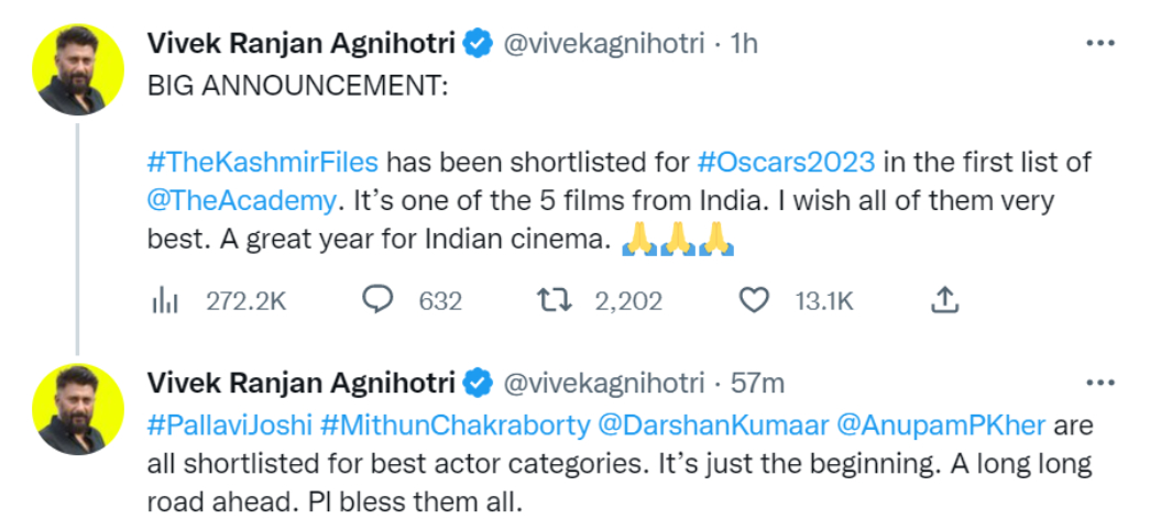 विवेक ने इसकी जानकारी शेयर करते हुए सोशल मीडिया में लिखा- द कश्मीर फाइल्स ऑस्कर 2023 के लिए एकेडमी की पहली लिस्ट में शॉर्टलिस्ट हुई है। यह भारत की 5 फिल्मों में से एक है। मैं उन सभी को शुभकामनाएं देता हूं। भारतीय सिनेमा के लिए एक बढ़िया साल। विवेक ने अगले ट्वीट में बताया कि पल्लवी जोशी, मिथुन चक्रवर्ती, दर्शन कुमार और अनुपम खेर बेस्टर एक्टर कैटेगरी में शॉर्टलिस्ट हुए हैं। उन्होंने कहा कि ये तो बस शुरुआत है, आगे बहुत लम्बा रास्ता है। कृपया इन सभी को अपना आशीर्वाद दें।