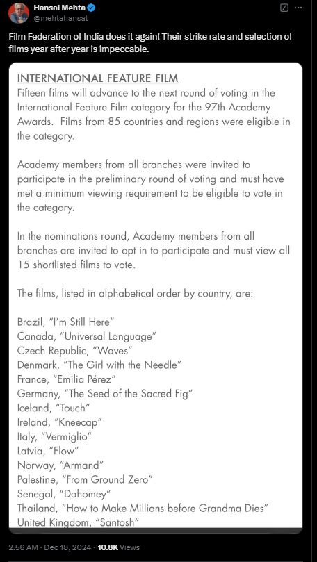 उन्होंने 'स्ट्राइक रेट और साल दर साल फिल्मों के चयन' को क्रिटिसाइज किया है। हंसल ने एक्स अकाउंट पर ट्वीट करते हुए लिखा, 'फिल्म फेडरेशन ऑफ इंडिया ने इसे फिर से कर दिखाया! उनका स्ट्राइक रेट और साल दर साल फिल्मों का चयन बेहतरीन है।'