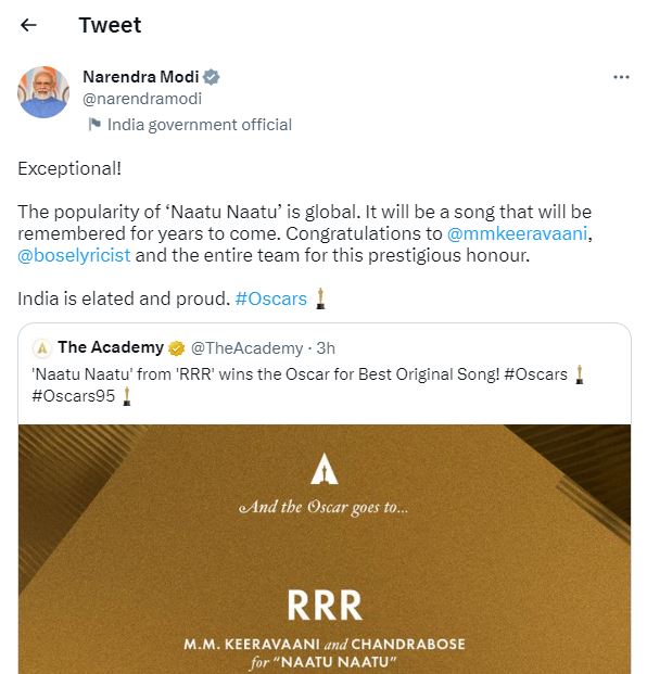 प्रधानमंत्री नरेंद्र मोदी ने 'आरआरआर' की टीम और 'द एलिफेंट व्हिस्परर्स' की पूरी टीम को इस सफलता के लिए बधाई दी। उन्होंने नाटू-नाटू गाने के लिए मिले अवॉर्ड पर अपनी खुशी व्यक्त करते हुए लिखा, 'बहुत ही शानदार। नाटू-नाटू गाने की लोकप्रियता दुनियाभर में हैं।