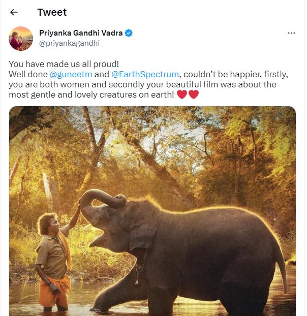 कांग्रेस महासचिव प्रियंका गांधी ने भी 'द एलिफेंट व्हिस्परर्स' की टीम की तारीफ की। उन्होंने ट्वीट करते हुए लिखा, 'आपने हम सभी को बहुत गर्व महसूस करवाया है। बहुत ही खूब गुनीत मोंगा और कार्तिकी गोंजाल्विस। इससे ज्यादा खुशी की बात कुछ और हो ही नहीं सकती थी।