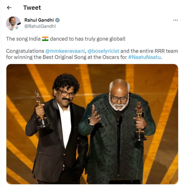 इसके अलावा नाटू-नाटू को बधाई देते हुए राहुल गांधी ने लिखा, 'भारत का गाना Naatu Naatu सही मायनों में अब ग्लोबल हो गया है।