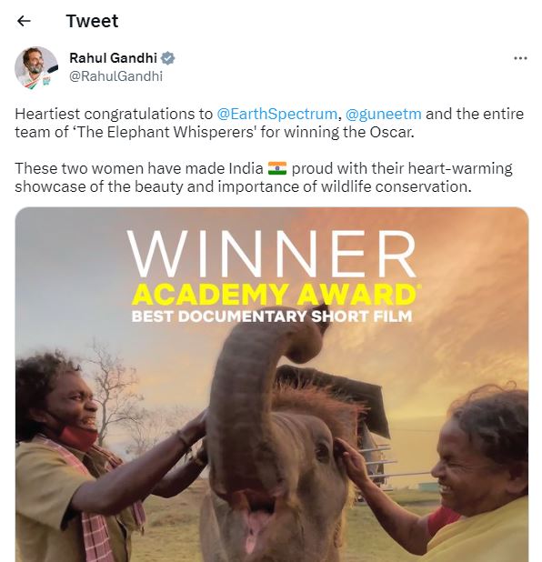 राहुल गांधी ने भी ऑस्कर जीतने वाली 'आरआरआर' और 'द एलिफेंट व्हिस्परर्स' की पूरी टीम को बधाई दी। उन्होंने 'द एलिफेंट व्हिस्परर्स' की टीम को बधाई देते हुए ट्वीट कर लिखा, 'ऑस्कर अवॉर्ड जीतने के लिए गुनीत मोंगा और कार्तिकी गोंजाल्विस की पूरी टीम को बहुत-बहुत बधाई।