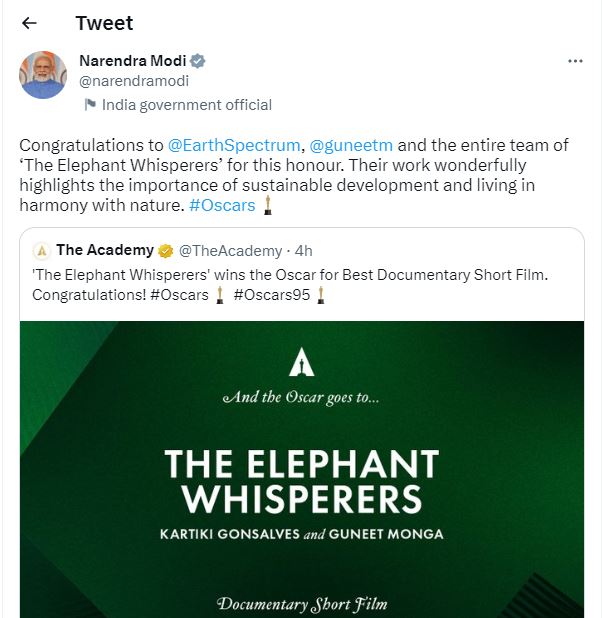 इसी के साथ ही शॉर्ट डॉक्यूमेंट्री 'द एलिफेंट व्हिस्परर्स' की पूरी टीम को बधाई देते हुए पीएम मोदी ने लिखा, 'गुनीत मोंगा और पूरी टीम को इस सम्मान के लिए बहुत-बहुत बधाई। आपका काम विकास और प्रकृति के साथ तालमेल कैसे बनाया जाता है, इस चीज को बखूबी दर्शाता है'।