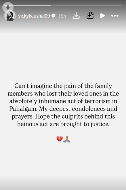 इसके अलावा विक्की कौशल ने लिखा, "उन लोगों के परिवार पर क्या बीत रही होगी, इसका अंदाजा भी नहीं लगा सकता। पहलगाम में हुआ ये आतंकी हमला इंसानियत की मौत है। उम्मीद करता हूं कि इन हत्याओं के आरोपी जल्द से जल्द पकड़े जाए"।