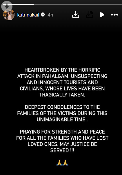 कटरीना कैफ ने लिखा, "पहलगाम में हुए इस आतंकी हमले से बहुत ही आहत हूं। कई निर्दोषों में इस घटना में अपनी जान गंवा दी"।