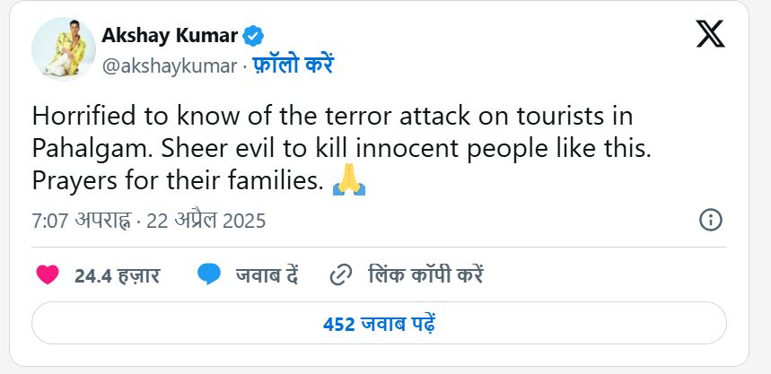 बॉलीवुड एक्टर अक्षय कुमार ने एक्स (पूर्व में ट्विटर) पर लिखा, “पहलगाम में पर्यटकों पर हुए आतंकवादी हमले की खबर सुनकर बेहद आहत हूं। इस तरह की निर्दोष लोगों की हत्या करना मानवता के नाम पर कलंक है। मृतकों के परिवारों के लिए मेरी प्रार्थनाएं हैं।” अक्षय के इस बयान के बाद कई और हस्तियों ने सोशल मीडिया पर दुख और गुस्सा जाहिर किया।