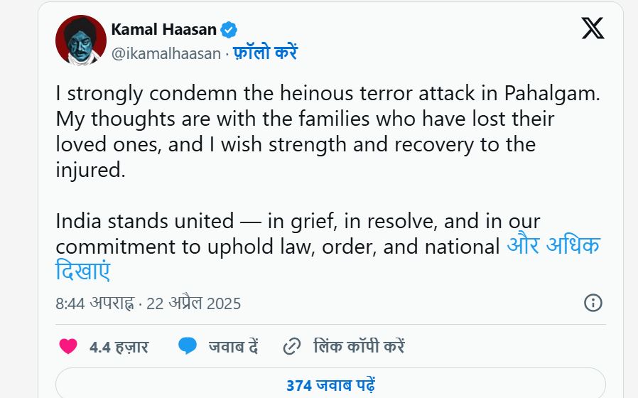 साउथ इंडस्ट्री के दिग्गज कमल हासन ने भी इस हमले की कड़ी निंदा की। उन्होंने लिखा, “मेरी संवेदनाएं उन परिवारों के साथ हैं जिन्होंने अपने प्रियजनों को खो दिया है। घायल हुए लोगों के लिए मैं शक्ति और शीघ्र स्वस्थ होने की कामना करता हूं। भारत एकजुट है और राष्ट्रीय सुरक्षा की रक्षा के लिए संकल्पबद्ध है।”