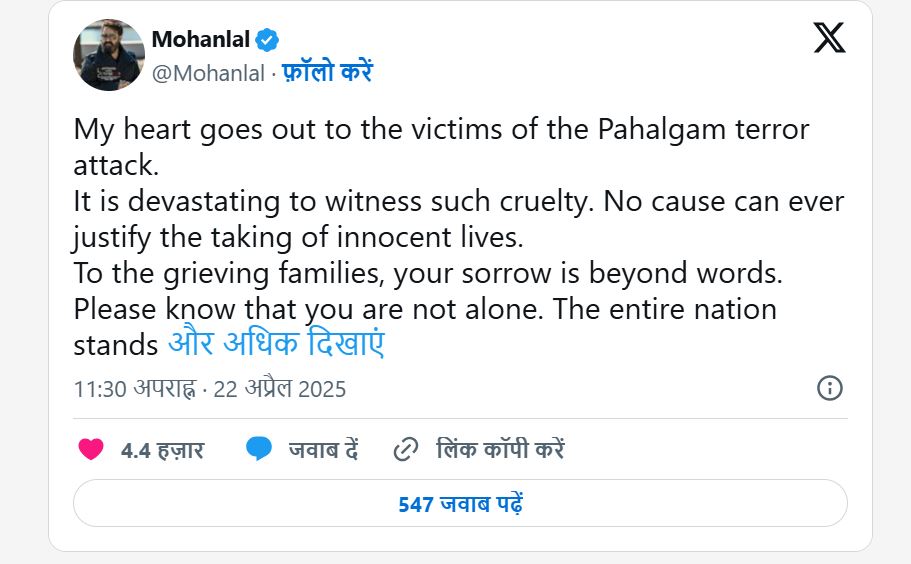 साउथ के दिग्गज अभिनेता मोहनलाल ने भी गहरा शोक व्यक्त किया। उन्होंने लिखा, “पहलगाम आतंकी हमले के पीड़ितों के प्रति मेरी संवेदना है। इस तरह की क्रूरता असहनीय है। कोई भी मकसद निर्दोष लोगों की जान लेने को जायज नहीं ठहरा सकता। पूरा देश शोक संतप्त परिवारों के साथ खड़ा है। आइए, हम सब मिलकर एक-दूसरे को थामे रहें और शांति की उम्मीद बनाए रखें।”