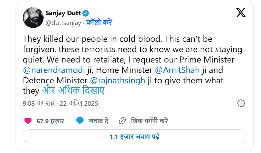 संजय दत्त ने एक्स पर लिखा, “उन्होंने हमारे निर्दोष नागरिकों को बेरहमी से मार डाला। यह क्षमा योग्य नहीं है। अब वक्त है जवाब देने का। मैं प्रधानमंत्री नरेंद्र मोदी जी, गृह मंत्री अमित शाह जी और रक्षा मंत्री राजनाथ सिंह जी से अनुरोध करता हूं कि वे इन आतंकियों को उनका हक दें।”