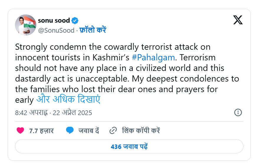 अभिनेता सोनू सूद ने ट्वीट करते हुए लिखा, “कश्मीर के पहलगाम में निर्दोष पर्यटकों पर हुआ कायरतापूर्ण हमला बेहद निंदनीय है। सभ्य समाज में आतंकवाद के लिए कोई जगह नहीं होनी चाहिए। पीड़ित परिवारों के प्रति मेरी गहरी संवेदना है। जो घायल हुए हैं उनके शीघ्र स्वस्थ होने की प्रार्थना करता हूं। ओम साईं राम।”