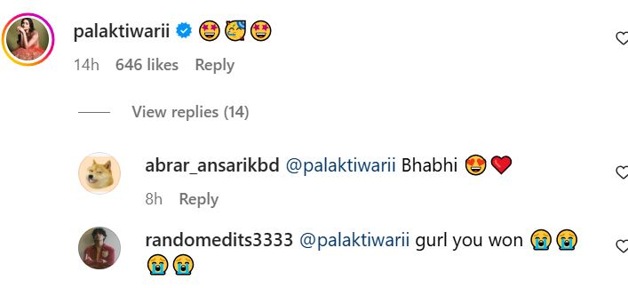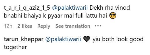 पलक तिवारी के इस कमेंट के बाद सोशल मीडिया पर फैंस उन्हें भाभी बुला रहे हैं। एक यूजर ने लिखा, "देख रहा है बिनोद, भाभी भइया के प्यार में फुल लट्टू है।" एक ने कहा, "आप दोनों साथ में बहुत अच्छे लगते हैं।" एक यूजर ने कमेंट किया, "भाभी।" इस तरह फैंस उन दोनों की सोशल मीडिया पर जुगलबंदी को पंसद कर रहे हैं।