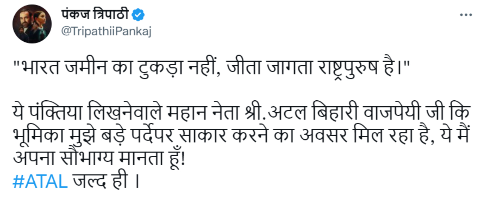 भारतीय राजनीति की इतनी बड़ी शख्सियत का किरदार निभाने का मौका मिलने पर पंकज त्रिपाठी खुद को खुशनसीब मानते हैं। पंकज ने कहा- ''पर्दे पर ऐसे राजनेता का किरदार निभाना सम्मान की बात है। वो सिर्फ राजनेता नहीं, बल्कि उससे कहीं ज्यादा था। जबरदस्त लेखक और विख्यात कवि। उन्हें पर्दे पर पेश करना मेरी खुशनसीबी है।''
