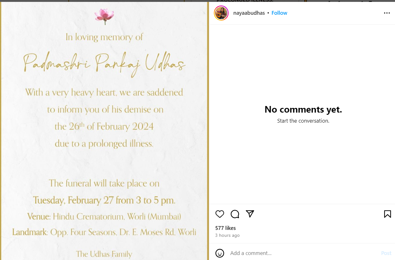 पंकज उधास (Pankaj Udhas) की बेटी नायाब उधास ने इंस्टाग्राम पर एक पोस्ट शेयर किया है, जिसमें गायक के अंतिम संस्कार की जानकारी साझा की गई है। इस पोस्ट में लिखा है, बहुत भारी मन से हम, आपको बता रहे हैं कि लंबी बीमारी के कारण 26 फरवरी 2024 को उनका निधन हुआ। अंतिम संस्कार मंगलवार, 27 फरवरी को दोपहर 3 से 5 बजे के बीच मुंबई के वर्ली में हिंदू क्रिमेटोरियम में होगा।