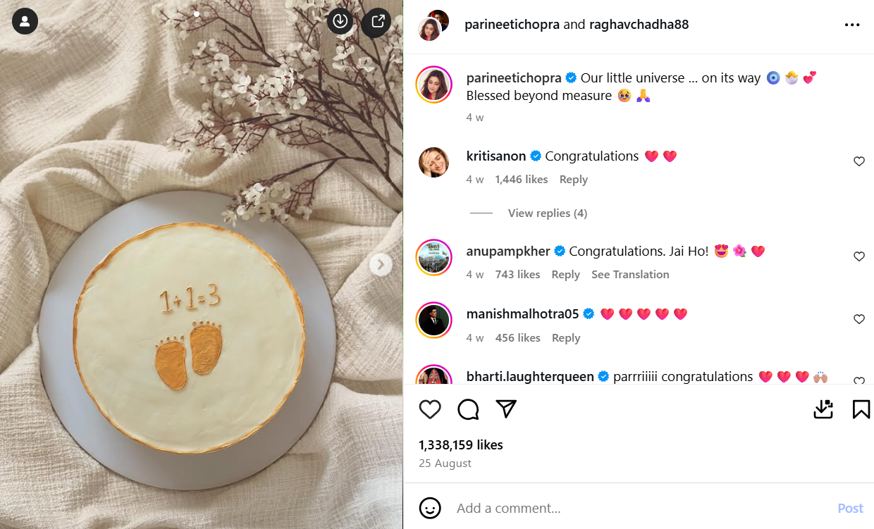 इससे पहले 25 अगस्त को परिणीति ने अपनी प्रेग्नेंसी की खबर सोशल मीडिया पर फैंस के साथ शेयर की थी। इस फोटो में एक केक था जिसपर "1 + 1 = 3" लिखा हुआ था। वहीं दूसरे में एक वीडियो थी जिसमें परिणीति और राघव एक दूसरे के हाथों में हाथ डालकर पार्क में जा रहे हैं। इसका कैप्शन था- हमारी छोटी सी दुनिया...अपने रास्ते में हैं।