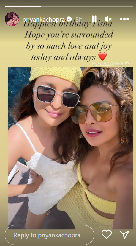 प्रियंका चोपड़ा ने भी अपने सोशल मीडिया पर परिणीति चोपड़ा के साथ एक खूबसूरत फोटो शेयर की है। इस तस्वीर में दोनों एक्ट्रेस बेहद खूबसूरत लग रही हैं। फोटो को शेयर करते हुए एक्ट्रेस ने लिखा 'जन्मदिन की शुभकामनाएं तिशा। आशा है कि आप आज और हमेशा बहुत प्यार और आनंद से घिरे रहेंगी'।