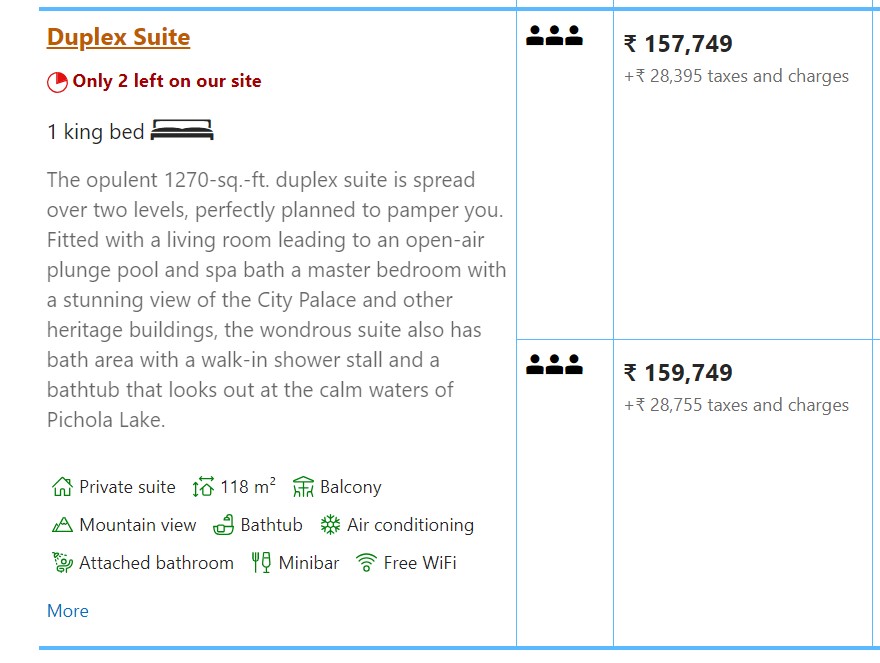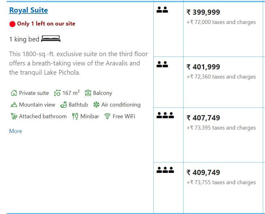इस कमरे का प्राइज और स्पेस दोनों ग्रैंड हेरिटेज गार्डन व्यू रूम सुइट से ज्यादा है। यहां से झील का मनोरम दृश्य देखने के लिए आपको एक दिन के स्टे के लिए कम से कम 54,000 पे करना पड़ेगा।