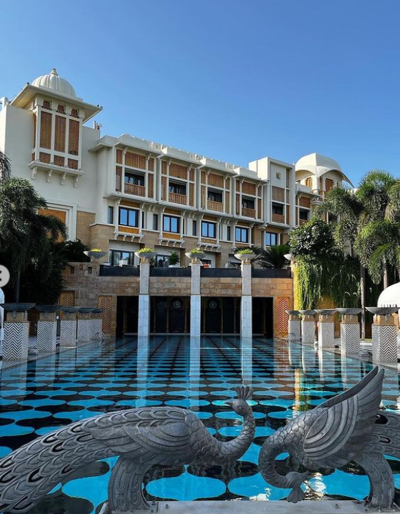 पैलेट को मार्बल और हाथ से की गई नक्काशी से सजाया गया है। यह राजस्थान के उदयपुर में स्थित होटल है, इसलिए यहां के इंटिरियर्स में राजस्थानी कल्चर की झलक जरूर मिलेगी। होटल की हर एक दीवार पर मेवाड़ी रियासत का महत्व साफ नजर आता है। यहां ऐसी पेंटिंग्स बनाई गई हैं, जहां राजस्थान की सुंदरता जरूर नजर आएगी। वहीं, कमरे के अंदर झरोके जैसी खिड़कियां और राजसी ठाट बाट वाले बड़े-बड़े बेड और सोफे हैं। सेलिब्रिटी और गेस्ट का मेवाड़ी अंदाज में वेलकम यहां की खासियत है।
