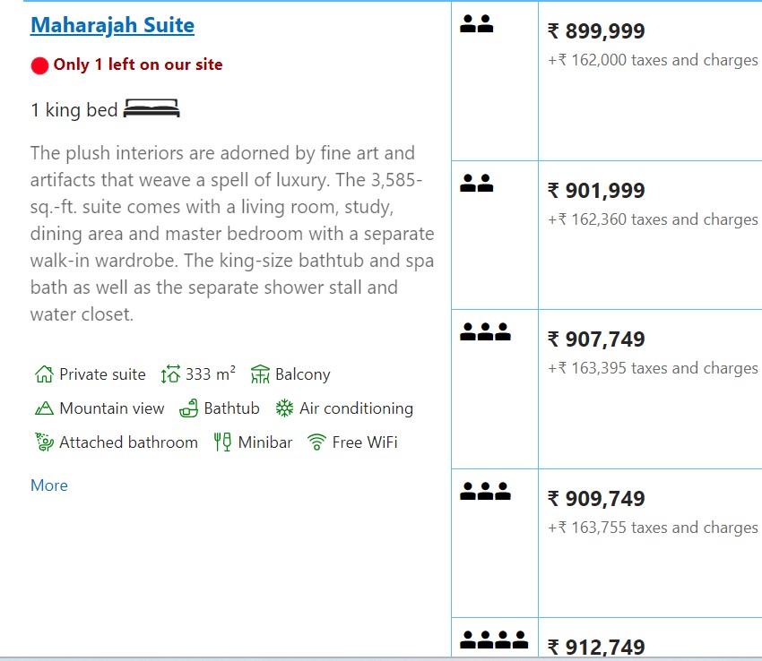 3,585 वर्गफीट में फैले महाराज सुइट का अधिकतम किराया 9 लाख रुपये से ज्यादा है। इस सुइट में लिविंग रूम, स्टडी, डाइनिंग एरिया, मास्टर बेडरूम, वॉक इन वॉर्डरोब, किंग साइज बाथटब और यहां तक कि मसाज के लिए अलग जगह भी है।