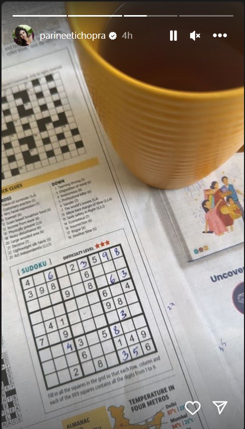 परिणीति ने इंस्टाग्राम स्टोरी पर सुडोकू खेलने की फोटो शेयर की है। कॉफी पीते-पीते परिणीति ने पूरा सुडोकू गेम सॉल्व कर लिया।