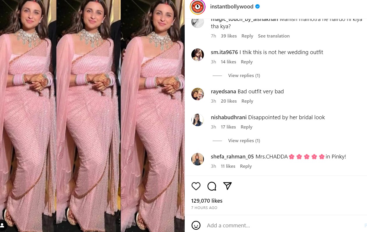 ऐसे लुक को कियारा आडवाणी, आलिया भट्ट, अनुष्का शर्मा जैसे सितारों ने भी अपनी शादी में कैरी किया था। परिणीति को भी उसी तरह के लुक में देख फैंस ने बधाई देने के साथ ही ट्रोल करना भी शुरू कर दिया। एक यूजर ने कमेंट किया कि एक्ट्रेस के चेहरे से ब्राइडल ग्लो गायब है।