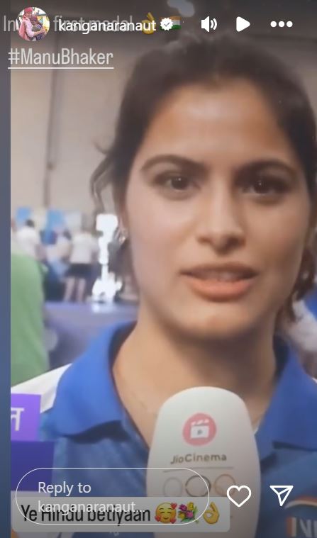 कंगना रनौत ने मनु भाकर का एक वीडियो इंस्टाग्राम पर शेयर किया है। उन्होंने बताया कि वह गीता पढ़ती हैं और मन में उसी के विचार चलते हैं। श्रीकृष्ण ने अर्जुन से कहा था कि अपने कर्म पर ध्यान दो। उन्होंने कहा कि उनके दिमाग में भी बस यही चल रहा था। कंगना ने वीडियो शेयर करते हुए लिखा, "भारत का पहला मेडल। ये हिंदू बेटियां।"