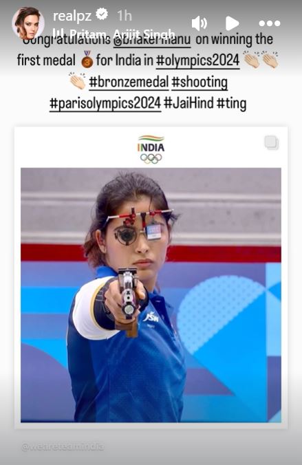 प्रीति जिंटा ने भी मनु भाकर की जीत का जश्न मनाया है। उन्होंने इंस्टाग्राम स्टोरी पर एथलीट्स को बधाई देते हुए एक पोस्ट शेयर किया है। मनु भाकर की जीत पर प्रीति जिंटा ने लिखा, "ओलंपिक 2024 में भारत के लिए पहला मेडल जीतने पर बधाई हो मनु भाकर।"