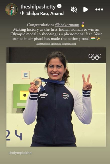 शिल्पा शेट्टी ने कहा, "बधाई हो मनु। शूटिंग में पहली भारतीय महिला के रूप में ओलंपिक मेडल जीतकर इतिहास रचना एक शानदार उपलब्धि है। एयर पिस्टल में आपके ब्रॉन्ज ने देश को गौरवान्वित किया है।"