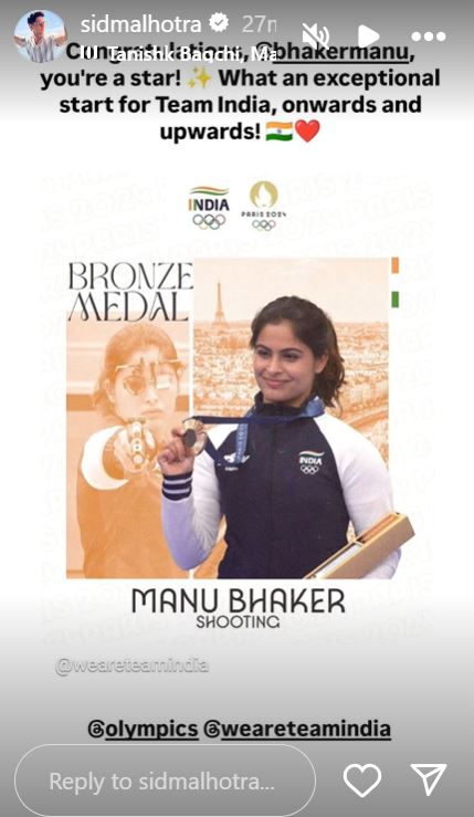 सिद्धार्थ मल्होत्रा ने मनु भाकर को स्टार बताया है। उन्होंने ब्रॉन्ज मेडल के साथ खिलाड़ी की तस्वीर शेयर कर लिखा, "बधाई हो मनु। आप एक स्टार हैं। भारत के लिए कितनी शानदार शुरुआत है।"
