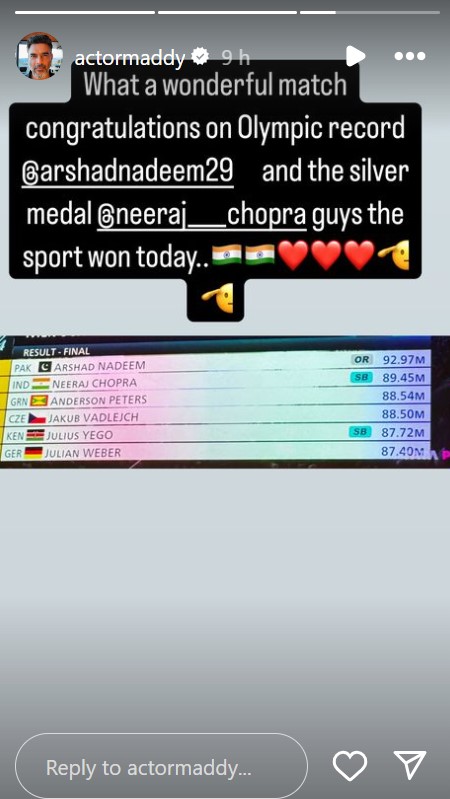 आर माधवन ने अपने सोशल मीडिया हैंडल इंस्टाग्राम की स्टोरी पर एक पोस्ट किया है, जिसमें जैवलिन थ्रो में जीतने वाले खिलाड़ियों का नाम दिखाई दे रहे हैं। इसे शेयर करते हुए 'शैतान' एक्टर ने लिखा है कि क्या शानदार मैच था, ओलंपिक रिकॉर्ड के लिए बधाई अरशद नदीम और रजत पदक के लिए नीरज चोपड़ा की भी तारीफ की।