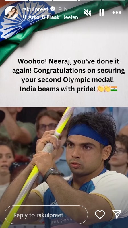 रकुल प्रीत ने भी सोशल मीडिया पर नीरज को बधाई देते हुए पोस्ट शेयर किया। उन्होंने लिखा कि वाह! नीरज, आपने फिर कमाल कर दिया। दूसरा ओलंपिक पदक जीतने पर बधाई। भारत गर्व से झूम रहा है।