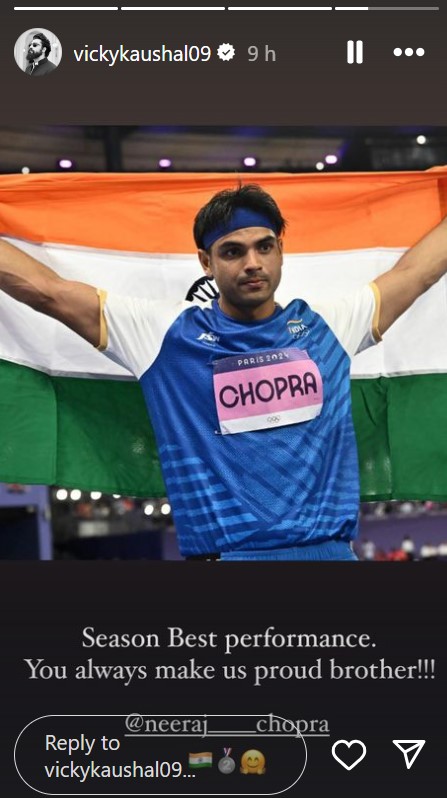 वहीं, दूसरी तरफ विक्की कौशल ने भी नीरज को बधाई देते हुए सोशल मीडिया पर उनकी एक तस्वीर शेयर की और लिखा कि सीजन का बेस्ट परफॉर्मेंस। आप हमेशा हमें प्राउड करवाते हो भाई।