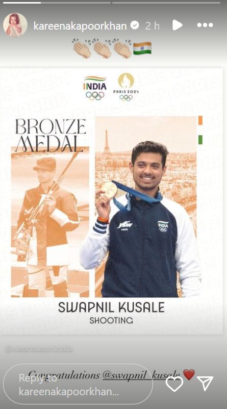 करीना कपूर खान ने भी स्वप्निल की जीत का जश्न मनाया है। उन्होंने अपने सोशल मीडिया हैंडल इंस्टाग्राम पर उनकी मेडल के साथ एक तस्वीर शेयर की है। इसके साथ ही उन्होंने एथलीट को बधाई भी है।