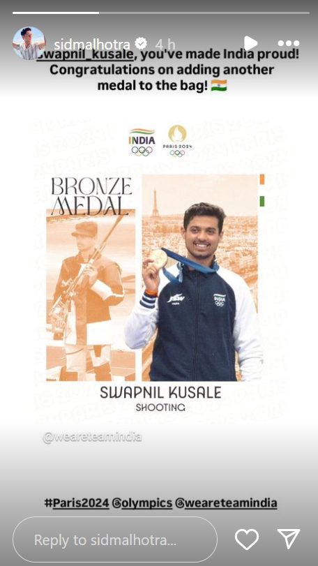 वहीं, सिद्धार्थ मल्होत्रा ने अपने इंस्टाग्राम पर स्वप्निल कुसाले को बधाई दी। एक्टर ने लिखा कि स्वप्निल कुसाले आपने भारत को गौरवान्वित किया है। एक और पदक जीतने पर बधाई।