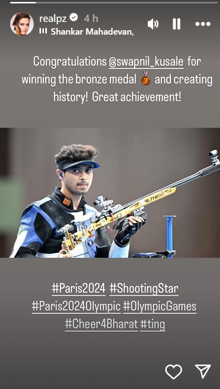 प्रीति जिंटा ने सोशल मीडिया पर बधाई देते हुए लिखा कि स्वप्निल कुसाले को कांस्य पदक जीतने और इतिहास रचने के लिए बधाई। शानदार उपलब्धि।
