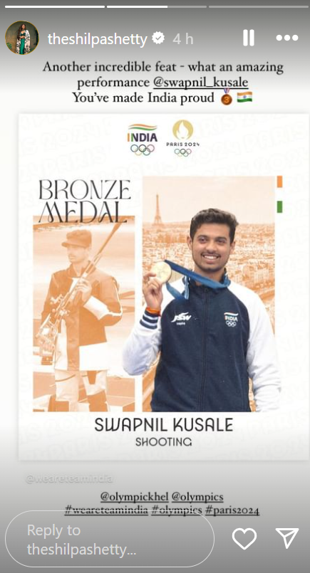 बॉलीवुड एक्ट्रेस शिल्पा शेट्टी ने भी मेडल विनर सराहना की है। इसके साथ ही उन्होंने लिखा है कि एक और अविश्वसनीय उपलब्धि। क्या अद्भुत प्रदर्शन स्वप्निल, आपने भारत को गौरवान्वित किया है।