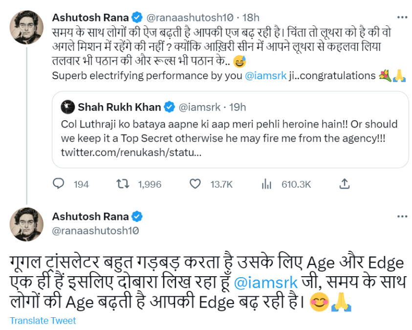 इस ट्वीट के कुछ देर आशुतोष को एहसास हुआ कि ऐज और एज में कुछ गड़बड़ हो गयी है। उन्होंने लिखा- गूगल ट्रांसलेटर बहुत गड़बड़ करता है। उसके लिए Age और Edge एक ही हं, इसलिए दोबारा लिख रहा हूं। शाह रुख खान जी, समय के साथ लोगों की एज (Age) बढ़ती है, लेकिन आपकी ऐज (Edge) बढ़ रही है।