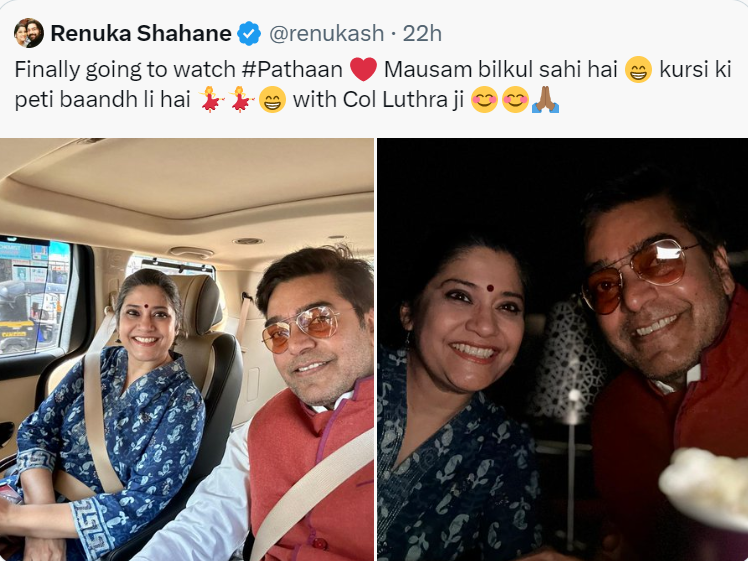 दरअसल, इसकी शुरुआत आशुतोष राणा की पत्नी रेणुका शहाणे के एक ट्वीट से हुई। उन्होंने आशुतोष के साथ एक फोटो शेयर कर लिखा था कि वो पठान देखने जा रही हैं। इस फोटो पर शाह रुख ने प्रतिक्रिया देते हुए लिखा- कर्नल लूथरा जी को बताया आपने कि आप मेरी पहली हीरोइन हैं। या हमें इसे गुप्त रखना चाहिए। नहीं तो वो, मुझे एजेंसी से निकाल देंगे।