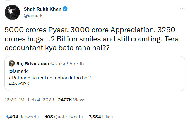 शाह रुख खान ने फैन के सवाल का जवाब देते हुए कहा, '5 हजार करोड़ लोगों का प्यार, 3 हजार करोड़ लोगों की तारीफें और 3250 करोड़ झप्पियां। 2 बिलियन लोगों के चेहरों पर मुस्कान आई और यह गिनती अभी जारी है। वैसे तेरा अकाउंटेंट क्या बता रहा है?' शाह रुख के इस जवाब पर फैंस फिदा नजर आए। एक्टर का ये ट्वीट सोशल मीडिया पर तेजी से वायरल हो रहा है।