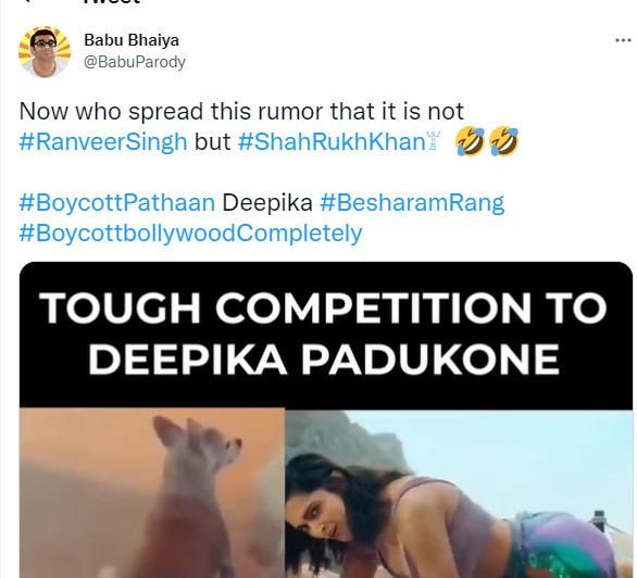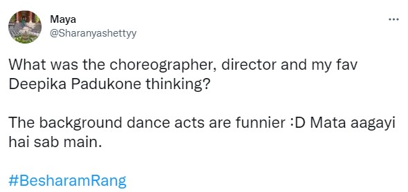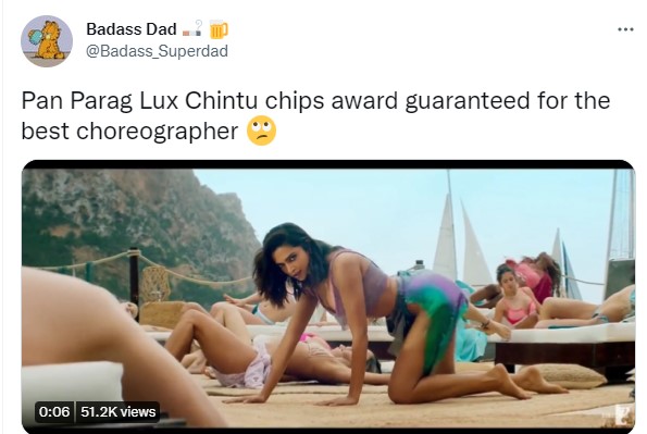 इस गाने में दीपिका पादुकोण के द्वारा किए गए ट्वर्क को लेकर काफी मजाक उड़ा रहे हैं और उस पर मीम्स बना रहे । इसी के साथ कुछ यूजर्स का ये भी कहना है कि इस गाने को खास अवॉर्ड से सम्मानित किया जाएगा। एक यूजर ने मीम शेयर करते हुए लिखा, 'बेस्ट कोरियोग्राफर को पान पराग लक्स चिंटू चिप्स अवॉर्ड मिलने की पूरी-पूरी गारंटी है'। दूसरे यूजर ने लिखा, 'मेरी पसंदीदा दीपिका पादुकोण, डायरेक्टर और कोरियोग्राफर सोच रहे थे? बैकग्राउंड डांस के डांस एक्ट बहुत ही फनी है। सब में माता आ चुकी है'। अन्य यूजर ने लिखा, 'जब आपको खुजली हो और आप कुछ ना कर सकें।