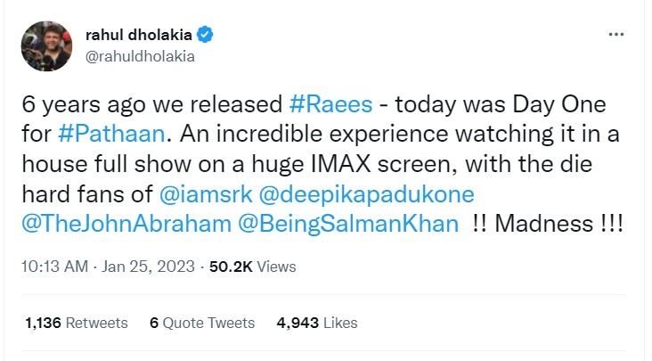 साल 2017 में आई शाह रुख खान की क्राइम ड्रामा फिल्म रईस को राहुल ढोलकिया ने निर्देशित किया था। अब बुधवार यानी रिलीज के पहले दिन ही राहुल पठान देखने आईमैक्स पहुंचे। इसके साथ ही उन्होंने फिल्म का रिव्यू भी किया और पठान को पागलपन कहा। ट्विटर पर फिल्म का रिव्यू देते हुए राहुल ने लिखा, "6 साल पहले हमने रईस रिलीज की थी। आज पठान का पहला दिन है। आईमैक्स के बड़े स्क्रीन पर शाह रुख के फैंस के साथ हाउसफुल शो में पठान देखना शानदार एक्सपीरियंस था।"