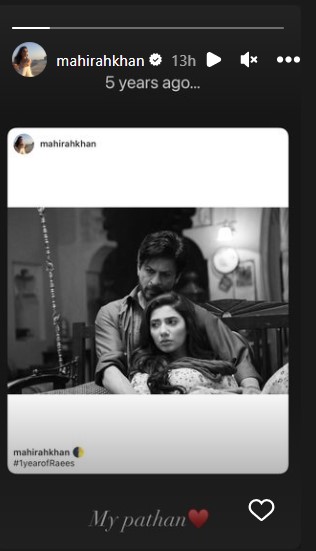 इस फोटो में वह किंग खान के साथ बड़े ही रोमांटिक अंदाज में बैठी हुई हैं। इस फोटो को शेयर करते हुए माहिर ने कैप्शन में लिखा, 'मेरा पठान' , इसी के साथ पाकिस्तानी एक्ट्रेस ने हार्ट वाला इमोजी भी पोस्ट किया। आपको बता दें कि माहिरा खान ने शाह रुख के साथ फिल्म 'रईस' में काम किया था, इन दोनों की जोड़ी को फिल्म में काफी पसंद किया गया था।