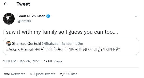 शाह रुख खान से फैंस ने #ASKSRK क्वेश्चन- आंसर में अपने फैंस से खूब बातचीत की। इस बीच शहजाद कुरैशी नामक एक शख्स ने किंग खान से ट्विटर पर पूछा, 'क्या मैं ये फिल्म अपने परिवार के साथ देख सकता हूं, इस लायक फिल्म है?