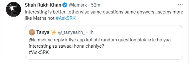 इसके अलावा एक यूजर ने लिया उनसे ये भी पूछा कि आप रैंडम सवालों के जवाब देते हैं कि सवाल दिलचस्प होने चाहिए। इसका जवाब देते हुए शाह रुख खान ने बोला, 'दिलचस्प हो तो अच्छा है। वरना वही सवाल वही जवाब होंगे। ऐसा लगता है मैं गणित पढ़ रहा हूं'।