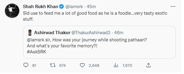 शाह रुख खान ने ये तो क्लियर किया ही कि परिवार के साथ इस फिल्म को देखा जा सकता है, लेकिन इसी के साथ उन्होंने फैंस के भी कुछ मजेदार सवालों के जवाब दिए। एक यूजर ने किंग खान से उनकी फिल्म 'पठान' की शूटिंग के दौरान की जर्नी के बारे में पूछा तो किंग खान ने कहा, 'सिड(सिद्धार्थ आनंद)बहुत फूडी है, तो वह मुझे अच्छा-अच्छा खाना खिलाता था, वही मेरी सबसे अच्छी यादें हैं'।
