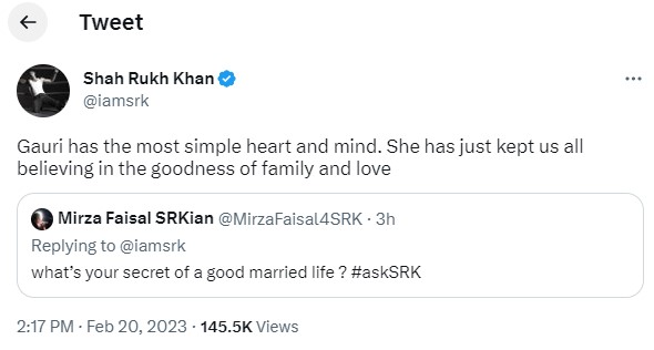 एक्टर ने लिखा, 'गौरी दिल और दिमाग दोनों से ही बहुत सिंपल है। उन्होंने हमेशा हमें परिवार के प्यार और परिवार की अच्छाइयों में यकीन दिलवाया है'। एक अन्य यूजर ने उन्हें इरफान खान की याद दिलाते हुए लिखा, 'दिग्गज एक्टर इरफान सर ने एक बार कहा था कि हॉलीवुड के पास शाह रुख खान नहीं है। इस बात का जवाब देते हुए शाह रुख ने लिखा, 'मैं उन्हें हमेशा याद करता हूं'।