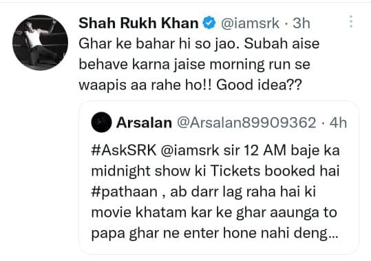 एक फैन ने एसआरके से इस सेशन के दौरान सवाल किया कि, 'मैंने पठान के 12 बजे के शो की मिडनाइट टिकट बुक की है। अब डर लग रहा है मूवी खत्म करके रात में घर आऊंगा तो पापा घर में एंट्री नहीं लेने देंगे।'
