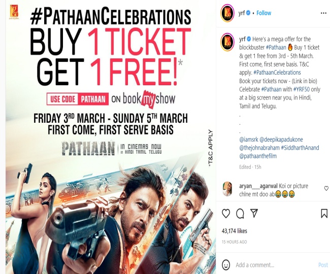यश राज फिल्म्स के ऑफिशियल इंस्टाग्राम अकाउंट पर एक पोस्ट में लिखा गया है कि यह ऑफर 3 मार्च से 5 मार्च तक मान्य होगा। 'यहां ब्लॉकबस्टर पठान के लिए एक मेगा ऑफर है.. 3 से 5 मार्च तक 1 टिकट खरीदें और 1 मुफ्त प्राप्त करें। पहले आओ, पहले पाओ के आधार पर। इस ऑफर का लाभ उठाने के लिए, दर्शकों को कूपन कोड- 'पठान' का उपयोग करना होगा।'