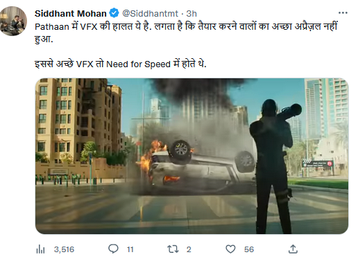 एक यूजर ने ट्रोल करते हुए लिखा, 'पठान के वीएफएक्स की हालत ये है कि लगता है तैयार करने वालों का अच्छा अप्रेजल नहीं हुआ। इसे अच्छे VFX तो Need for Speed में होते थे।