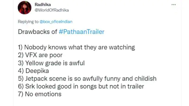 'पठान' का ट्रेलर देखने के बाद एक यूजर ने लिखा, 'लो क्लास वीएफएक्स और विज्ञापनों से कॉपी जैसे वॉर, टीजेडएच, बीस्ट, साहो, बैंग बैंग जैसी फिल्में। डायलॉग भी बेहद खराब। भगवान भरोसे पठान, अपने बेकार काम के तरीके की वजह से एक और फ्लॉप।